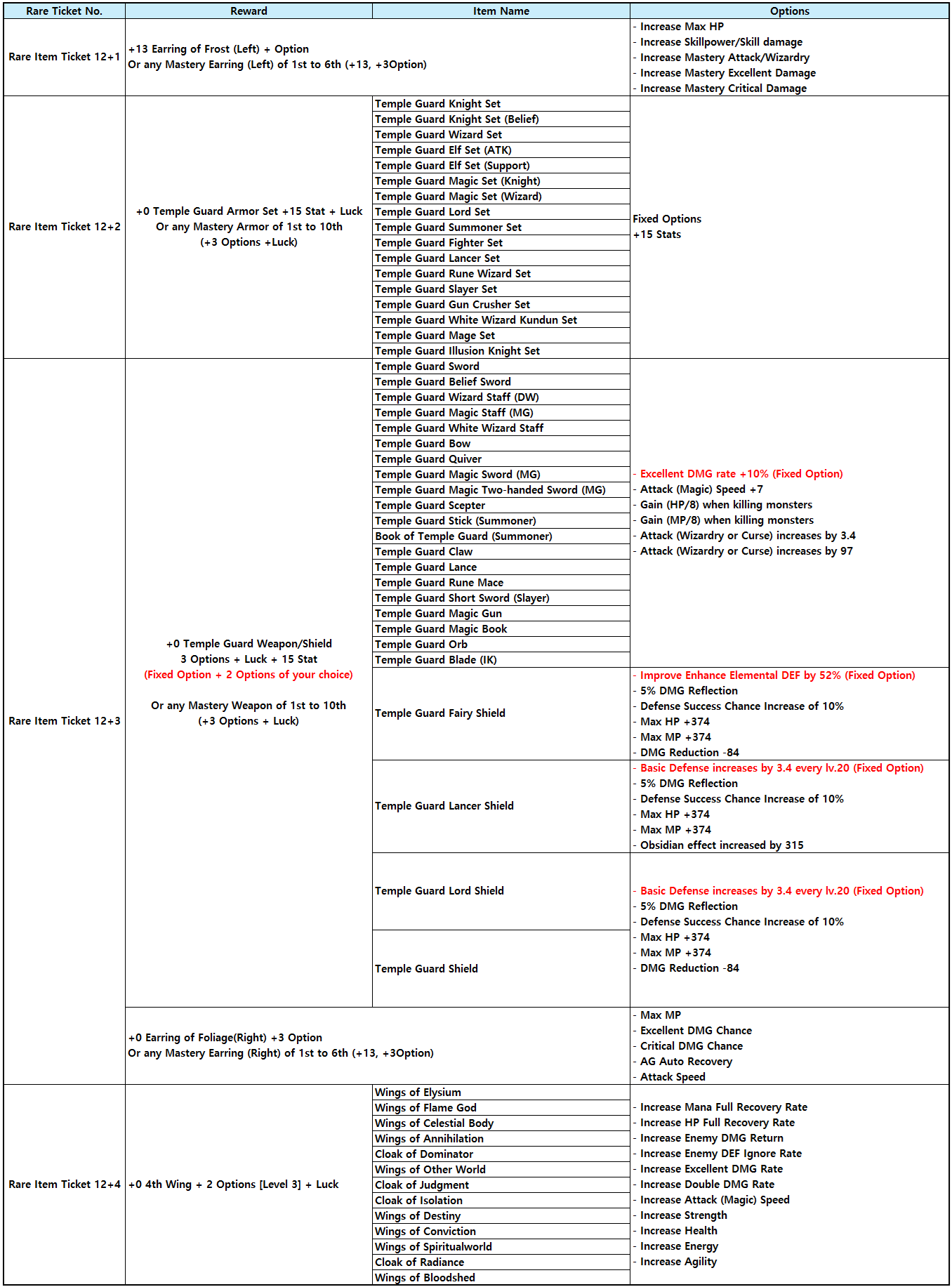 - Mastery Earring (Rare Ticket 12+1) : 1st (Wrath) ~ 8th Mastery Earring (Frost) can be exchanged upon choice